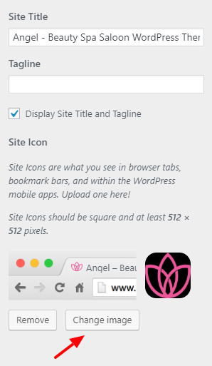 2. Now, Click Change image and upload the image you want to use as your site icon. We suggest to use an image that has a dimension of 512 by 512 pixels.
