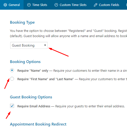 2. Go to General > Choose Guest Booking, Choose Booking Options, Guest Booking Options, Appointment Booking Redirect etc.